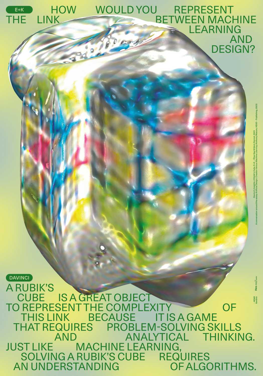 Considering Davinci – an AI model trained with OpenAI’s GPT-3 model – as the 3rd member of the studio, Elise Gay and Kévin Donnot question the relationship between graphic design and AI. On this poster (pigment printed on paper, the Rubik’s Cube is shown as a three-dimensional model generated by a neuronal network.