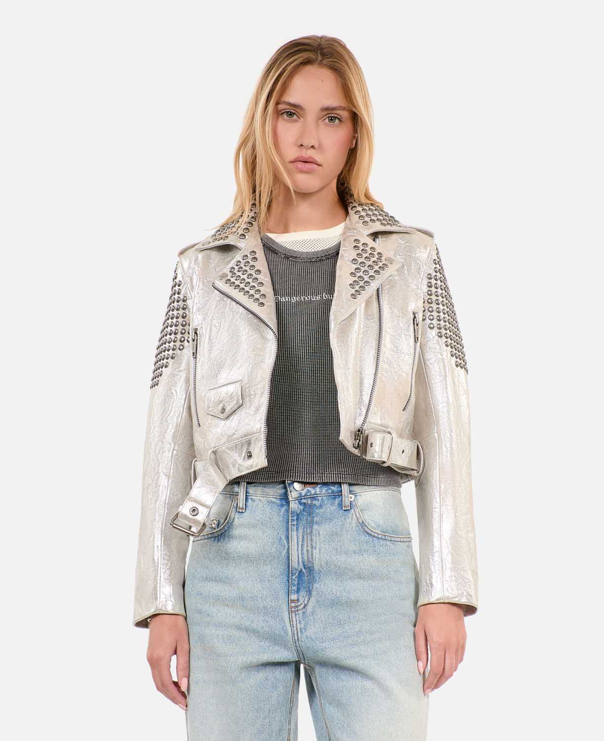 This collection from the brand The Kooples, generated using generative AI and illustrated here by a smooth metallised leather bomber jacket with gunmetal studs, gives a glimpse of how this technology can become a tool for fashion designers and not a way to replace them.