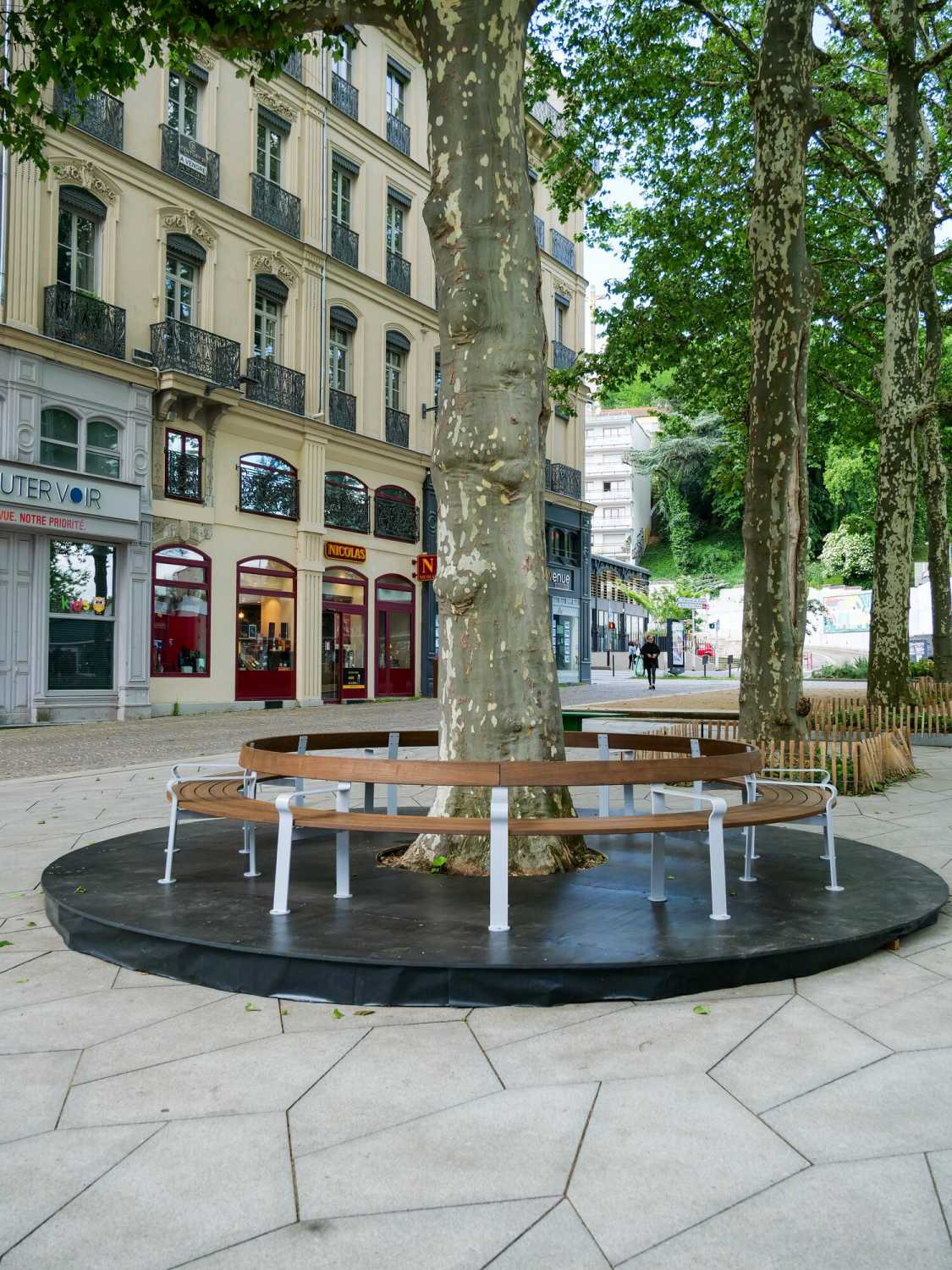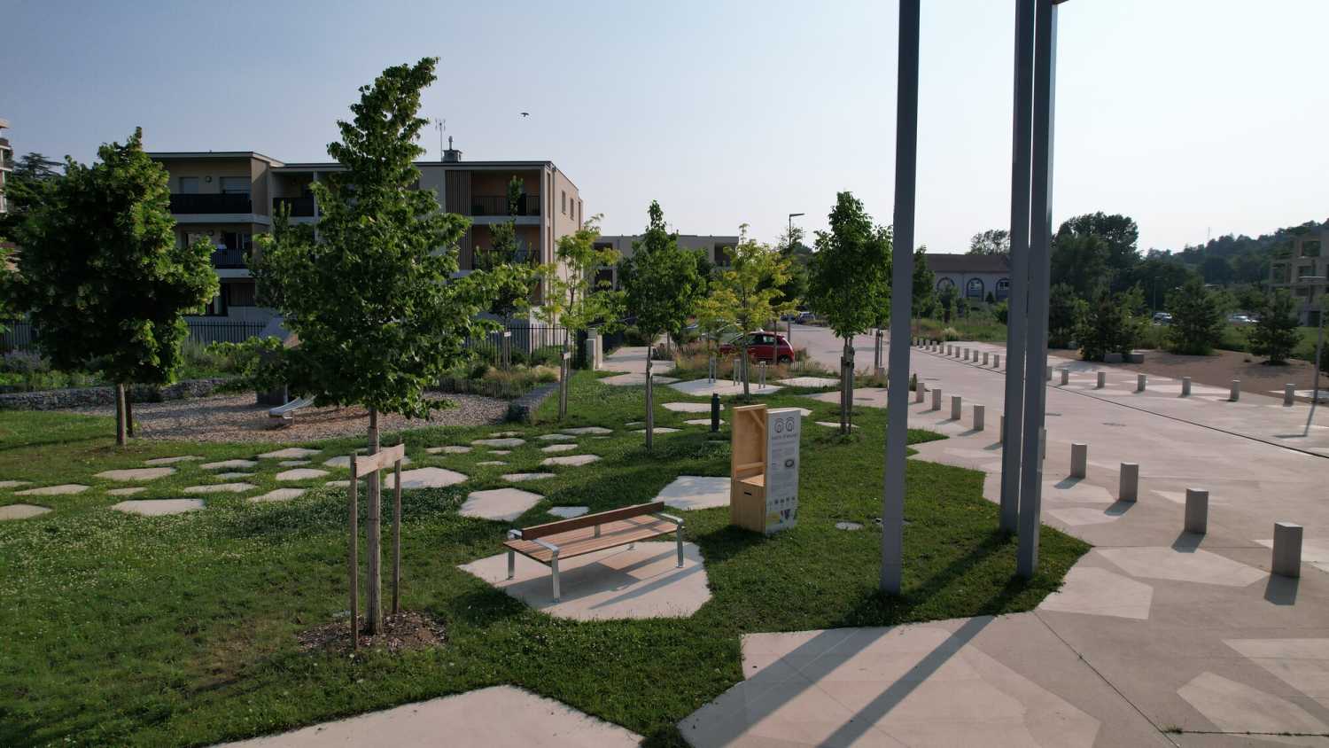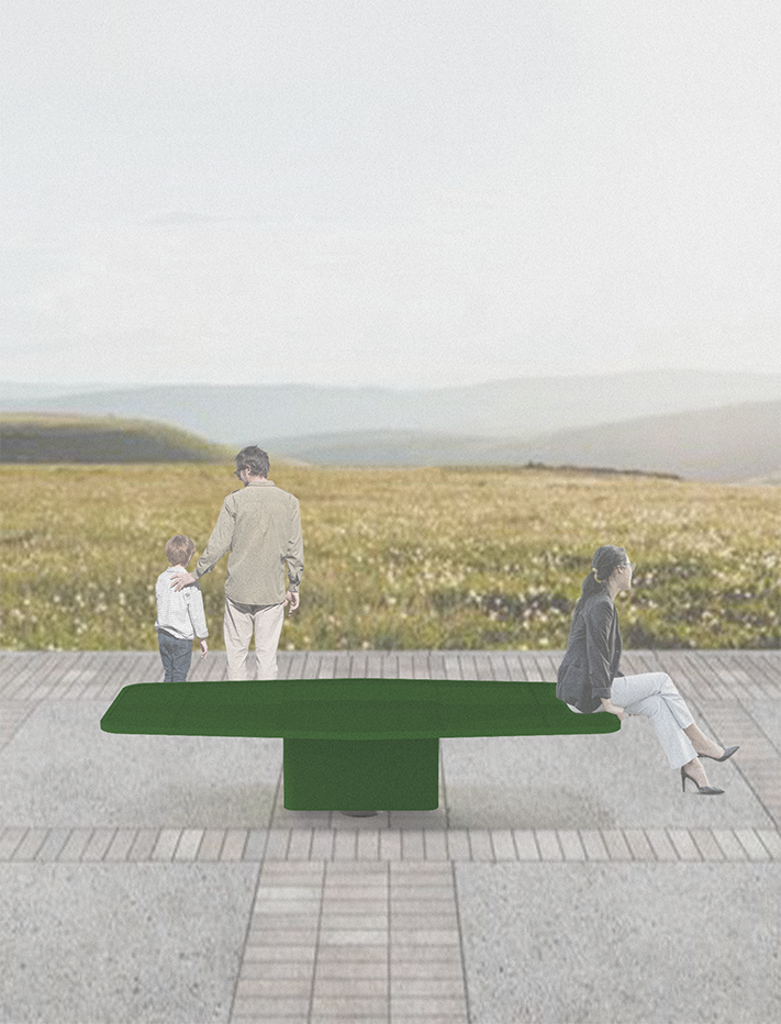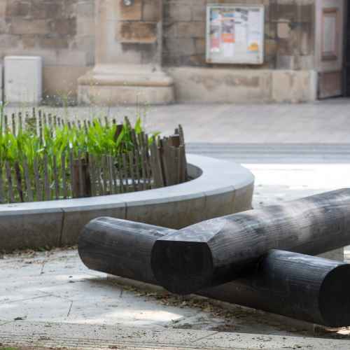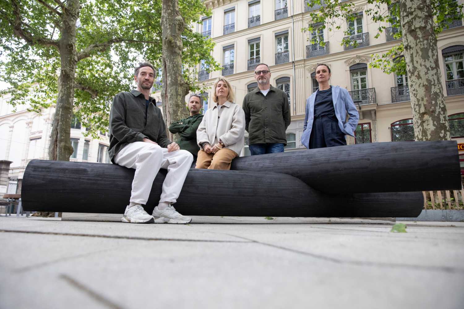 Semblable à deux morceaux de bois « tombés du ciel », échappés du hasard ou du temps, le banc Empreintes, avec ses formes brutes, se pose dans l’espace urbain, brisant l’ordre établi. La réflexion de Numéro 111 s’ancre dans cette dualité entre l’organique et le construit. Sa position dans l’espace, ses lignes, sa taille, ses inclinaisons ne dictent aucune posture : elles suggèrent et laissent place à une libre appropriation.